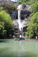 沿著石階,一個峰回路轉(zhuǎn)就到了龍吟潭邊,抬頭就會看到瀑布從90米高的懸崖上瀉入龍吟潭。站在壩上,撲面迎來一股涼爽的水汽。龍吟潭底建有水底龍宮,供人游覽,游玩龍宮出來后就坐小木船入洞游覽勝景??戳似俨嫉紫碌?/span>5個小洞,船就進(jìn)入冬暖夏涼的龍游洞,一到洞內(nèi)碼頭,就看到洞內(nèi)的巨大洞窟,不看路標(biāo)說不定還會繞暈?zāi)?,游了水簾洞,盤龍瀑就進(jìn)入臥龍?zhí)?,靠著巖壁入洞中,盤繞上有33米高的圓壁樓梯就是懸空洞,從梯頭拍洞景,往下拍像玫瑰花,向前拍像洞中長廊,洞中倆旁洞室相連,有人防洞,會議廳,餐廳,廁所,廚房和洞宇文化宣傳窗。