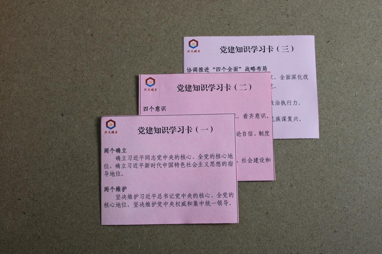 興天礦業(yè)黨支部對各類黨建名詞進行收集整理制作成卡片,在每次周學習前進行發(fā)放和學習,以更直觀、更靈活的方式,幫助大家適時加強學習、領(lǐng)會實質(zhì),讓初心在不斷學習地過程中更加純粹,讓使命在不斷學習地過程中更加堅定。