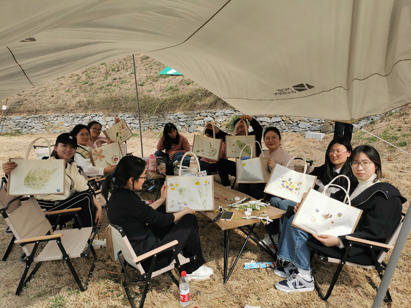三月春意盎然,大家在指定區(qū)域采集新鮮植物,并通過自己的設(shè)計(jì)將植物拓染在帆布包上,留下了春天的印記,把春色“袋”回家。